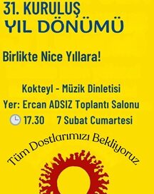 DAVETLİSİNİZ. 31. Kuruluş Yıldönümümüz nedeni ile 7 Şubat Cumartesi günü saat 17:30 da sendika binamızda düzenleyeceğimiz Kokteyl ve Müzik Dinletisi