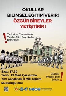 ÇEDES PROJESİ İPTAL EDİLSİN! şiarı ile bugün saat 17:30’da İl Milli Eğitim Müdürlüğü önünde yapılacak kitlesel basın açıklamasına katılımınızı bekliyoruz. EĞİTİM-SEN Ç.KALE ŞUBE